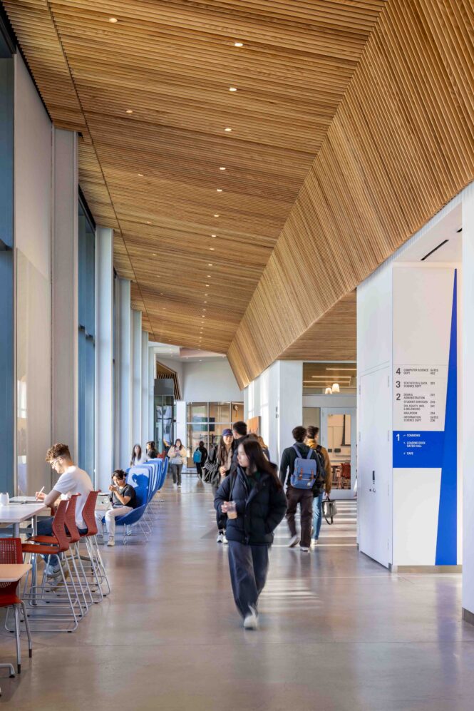 The ground floor is a lively and engaging destination, particularly for undergraduates. A student “ramble” along the courtyard edge provides places for individual and small group study, while the café, Commons, large interactive classroom, design lab, and a series of large builder labs encourage students to collaborate. With its generous ceiling height and canopy of wood slats, the ground floor spaces are dynamic, warm, and welcoming.